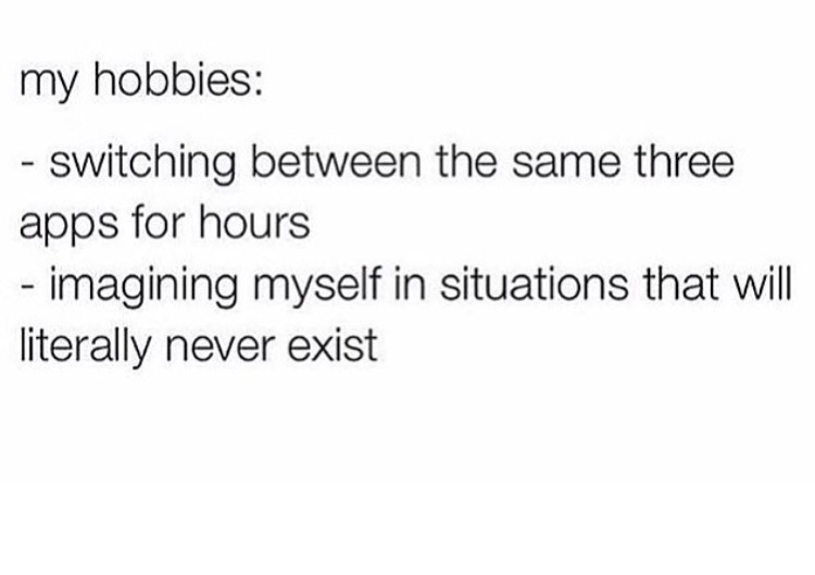 JUST DON’T ASK ME! Are you interviewing me for a job? If so, WHY DO YOU CARE WHAT I DO OUTSIDE OF WORK! Are you trying to get to know me? If so… ok fine in that case you can ask someone what their hobbies are. But then don’t judge me when I tell you and you’re not that impressed by how I like to write but haven’t had anything published, or how I have a blog, but don’t really update it. Is tweeting a hobby? My twitter timeline isn’t that interesting, either…